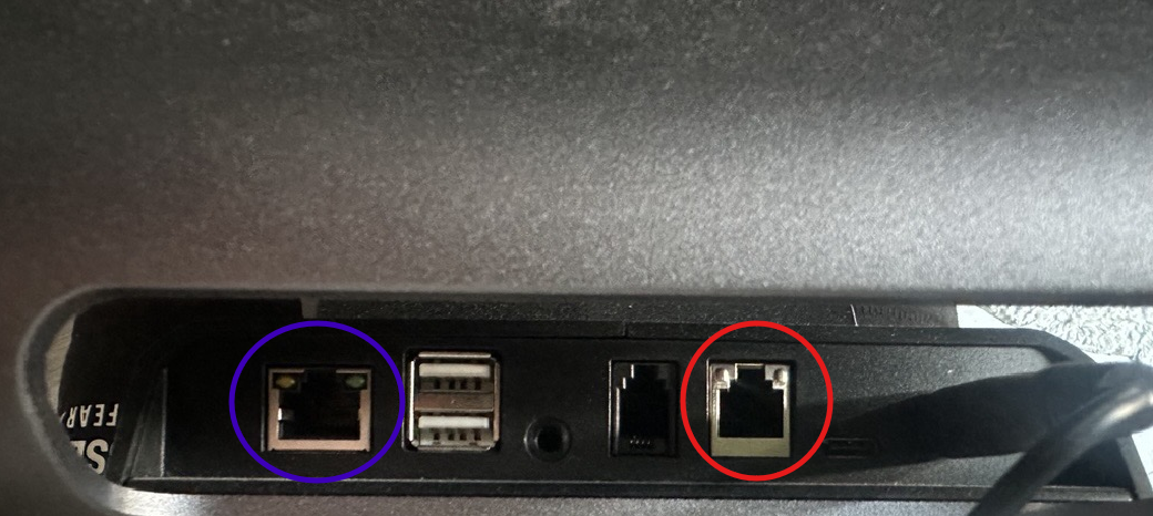 - Insert the cash drawer cable into the cash drawer port. On the image below, the Cash Drawer port is in red circle. The Ethernet (LAN) port is in blue.