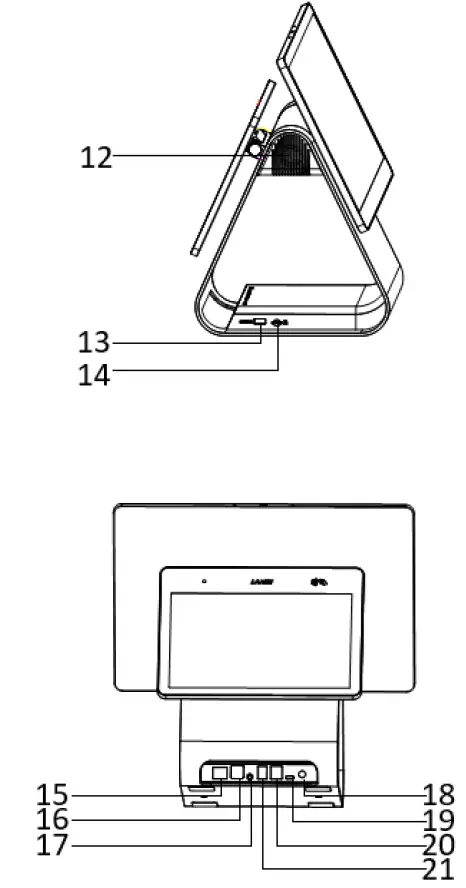 - To power on/off the terminal, connect the power supply to the power port (18), press and hold the power button for a few seconds. Follow the on-screen instructions for initial setup and configuration.