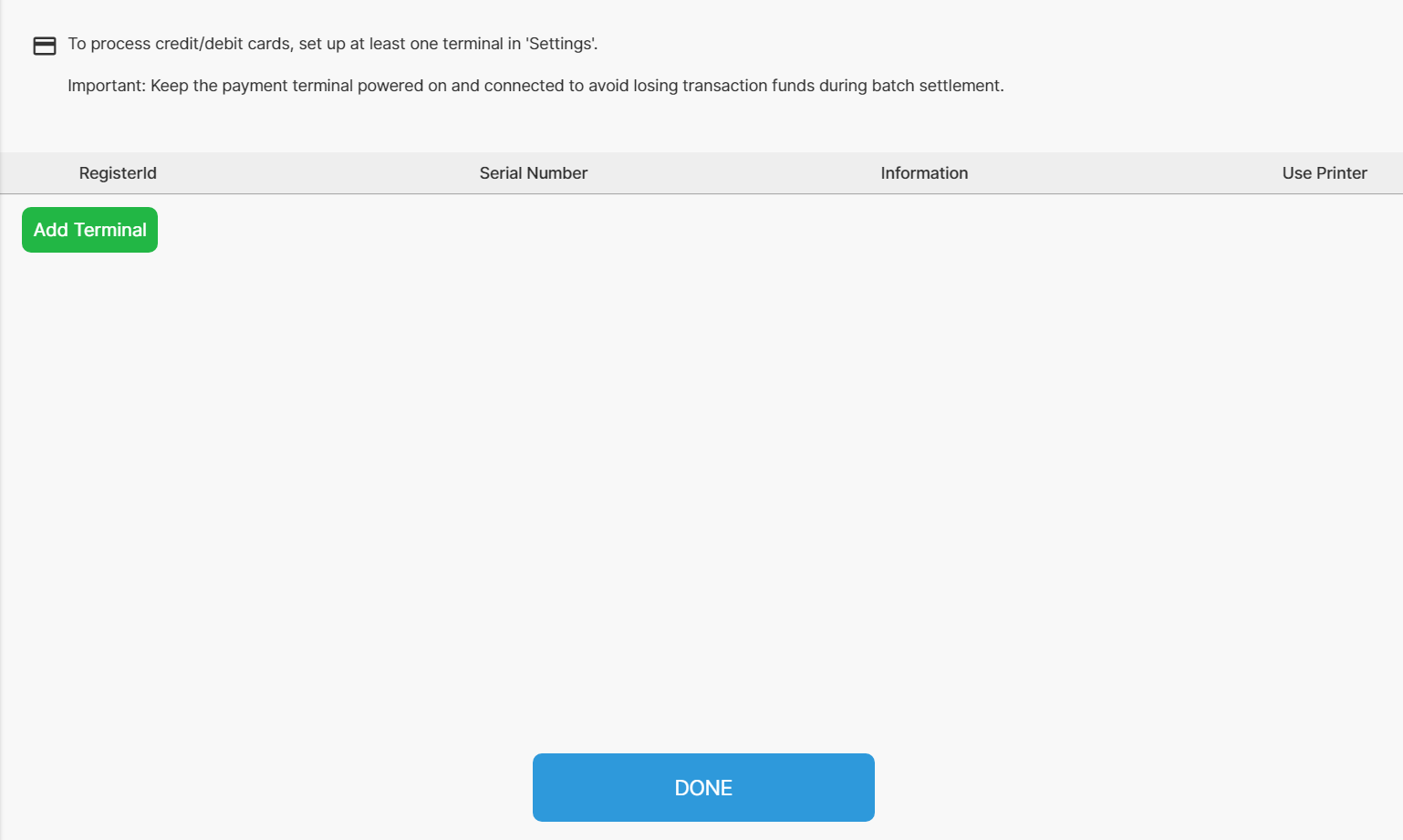 In your POS go to Setting > Terminals > add Terminal > enter the required credentials > hit Done.
