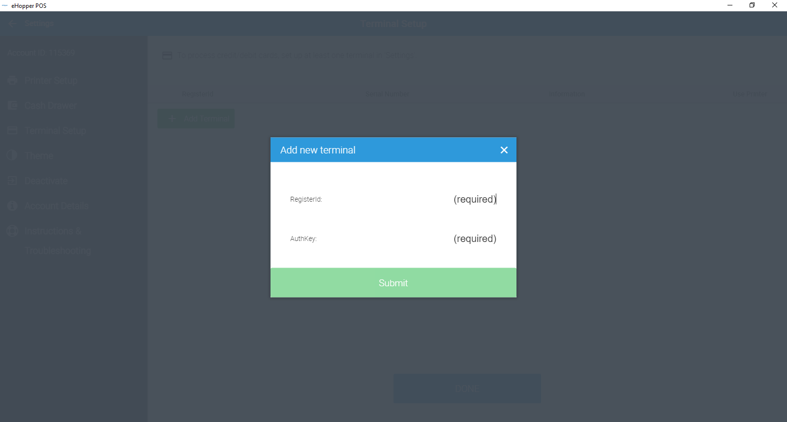 2. Enter the terminal's RegisterId and AuthKey.