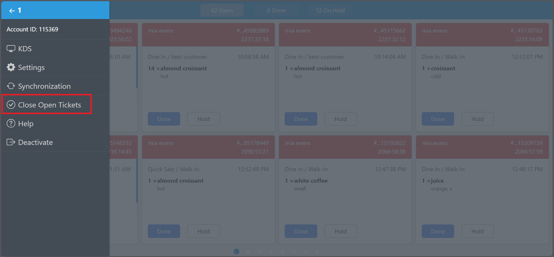To mark all open tickets as done, please go to KDS navigation menu and tap Close Open Tickets: