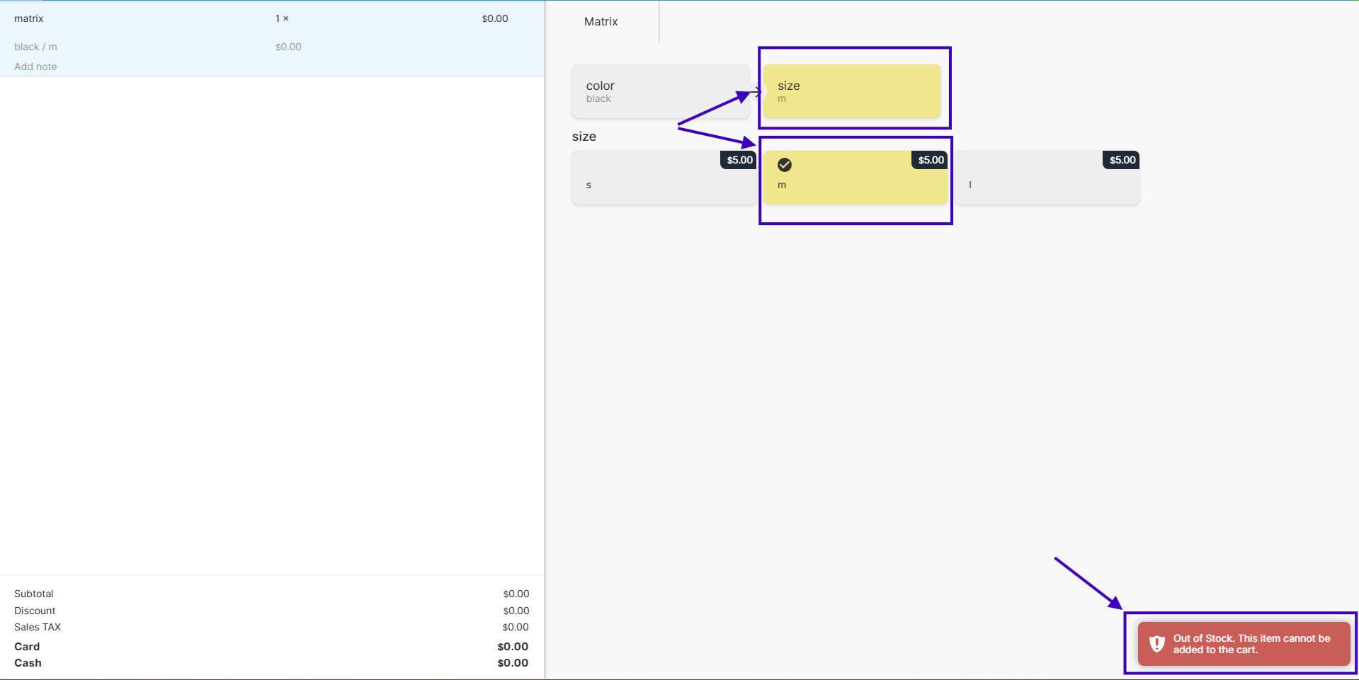 If the selected variant has insufficient stock, POS blocks the action and displays a stock error.