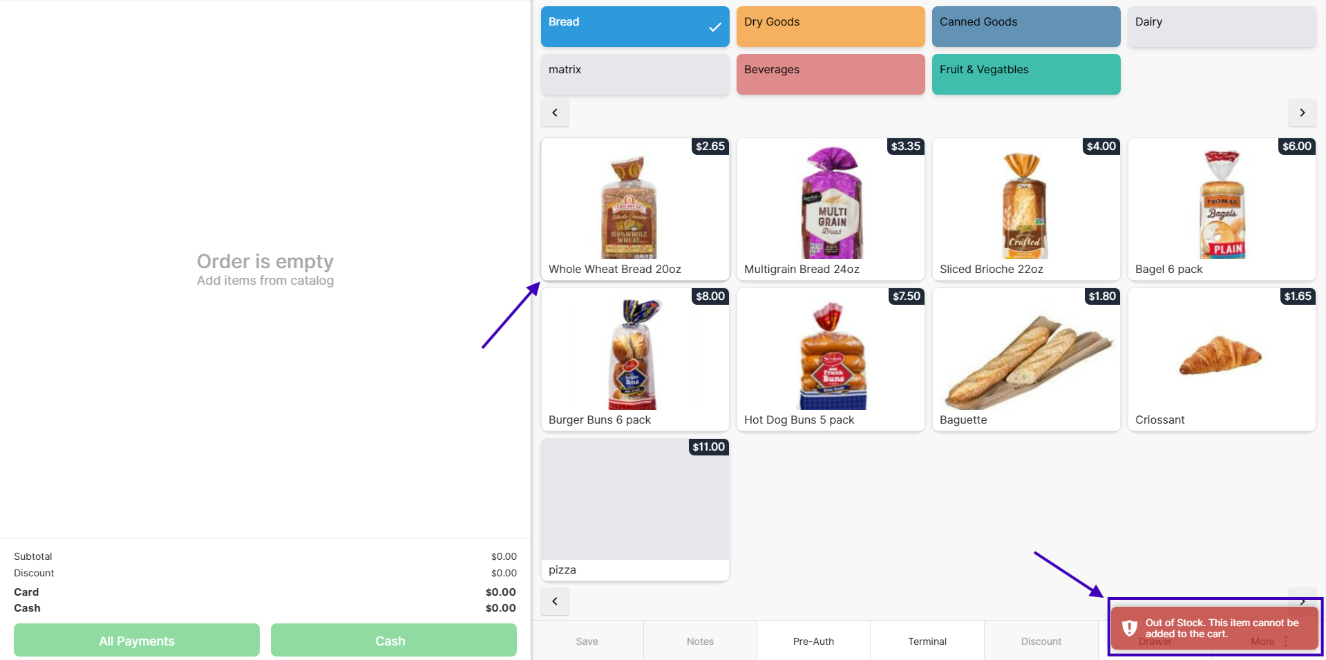 If the stock is zero or unavailable, POS blocks the add action entirely.