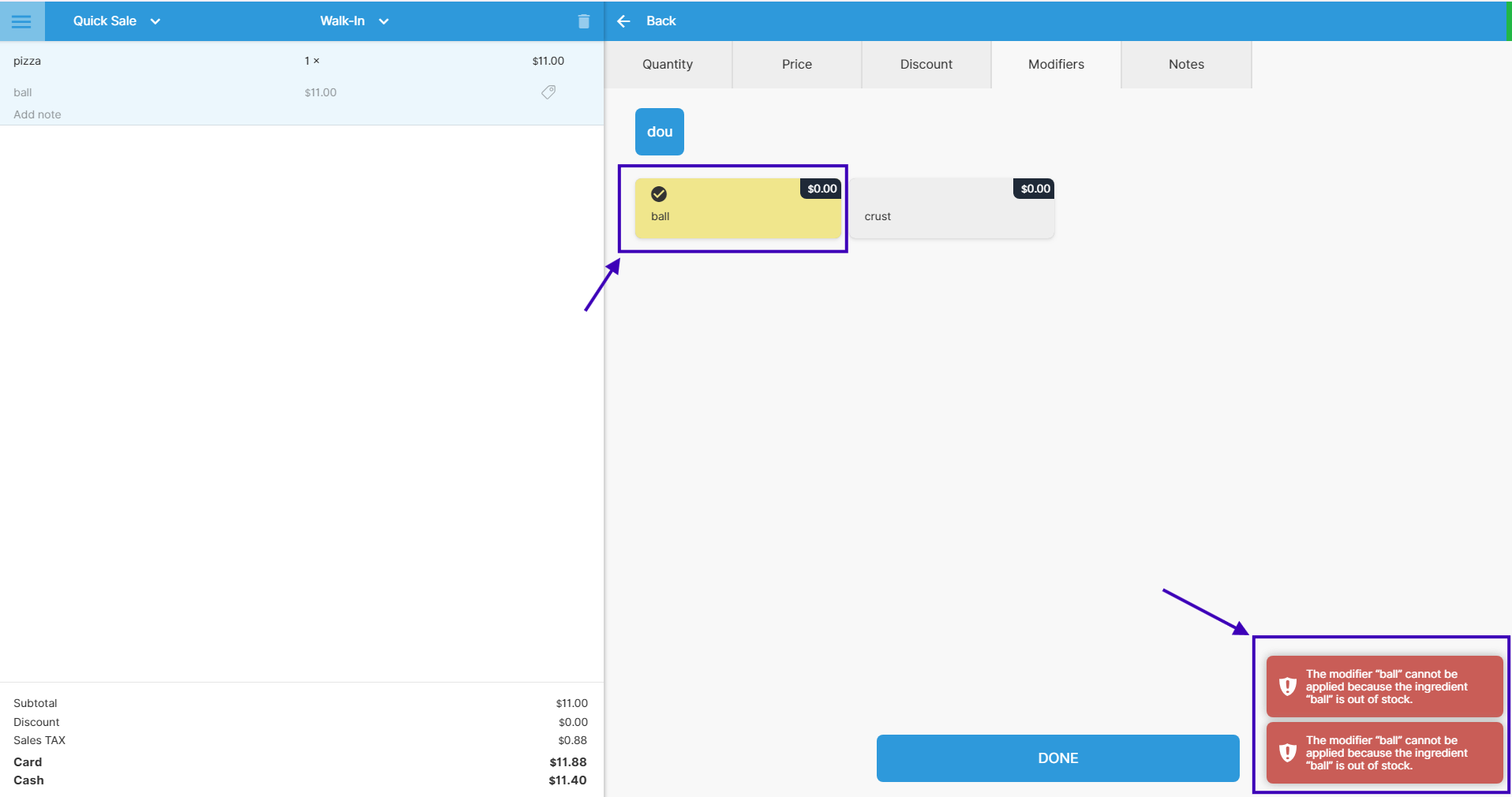 If a modifier’s required ingredient is out of stock, that modifier cannot be applied.