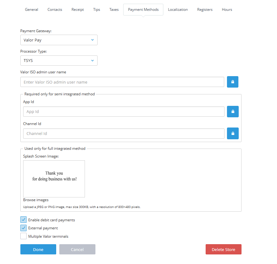 3. Click Payment Gateway tab--->select Valor in Payment Gateway drop-down menu > select your processor > enter ISO username > enter App ID --->click Done